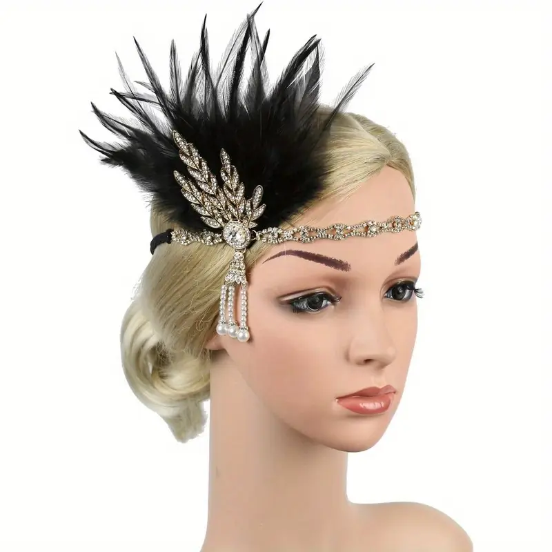 This leaf medallion headpiece is designed to be vintage style, with black feathers and beaded strings.
