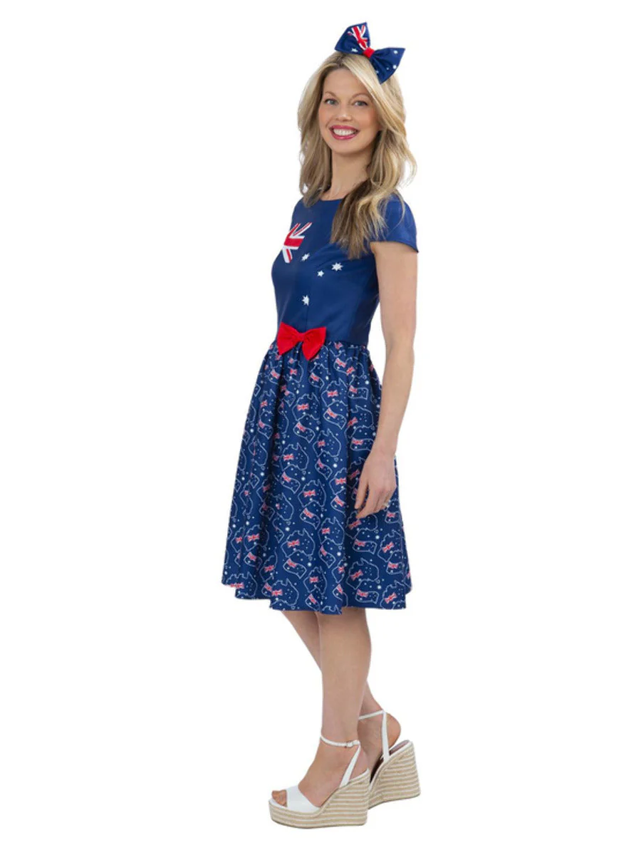 Costume has the Australian flag and the outline of Australia printed in white all over the skirt section.