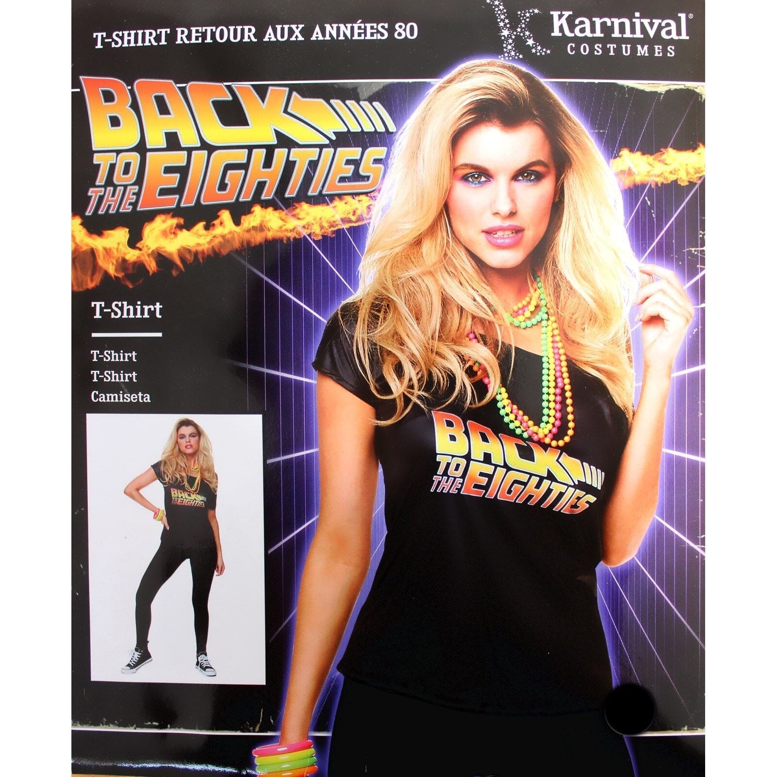 Costume includes 1 black 80s style T-shirt with a back to the eighties design on the front.