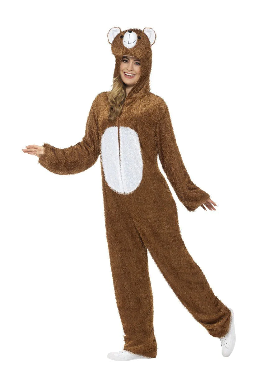 This super all-in-one adults unisex cream and golden brown bear fancy dress costume has a tail, white stomach and hood with the face and ears of a bear on top.