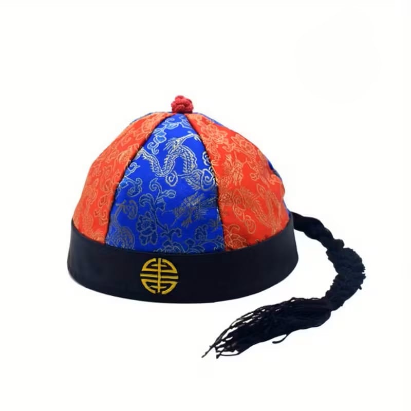 Sensational oriental Chinese hat for your dress up party! Comes in one size (fits up to 51cm head). Ponytail attached at back.