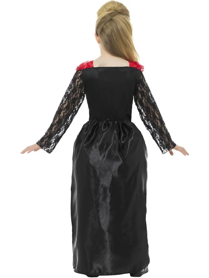 Girls dress has long black lace sleeves with red lace over the shoulders as well as printed white and red glitter rib-cage on the bodice.