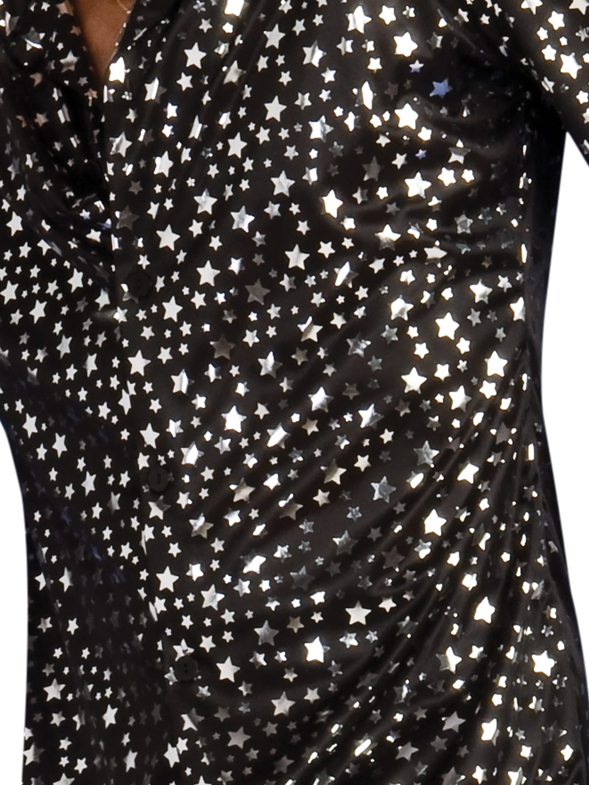 Shirt is black with silver printed stars which are shiny and buttons up in the front