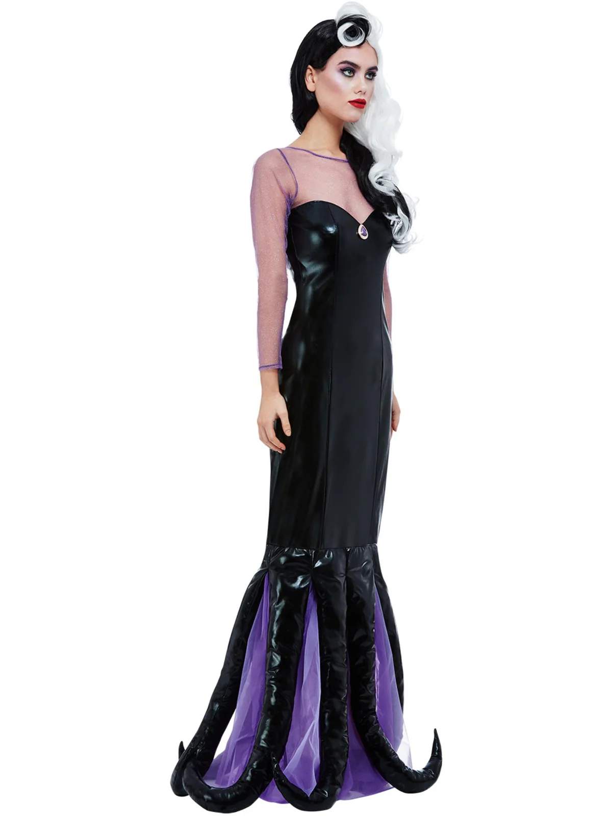 Featuring a dramatic black wet-look dress with eerie purple mesh detailing, this costume captures a bold and mysterious underwater look. The attached tentacles and layered design add depth and movement, creating a truly standout costume.