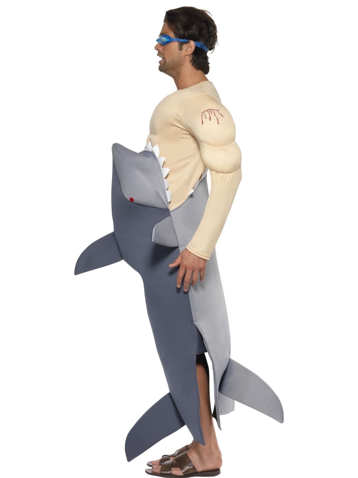The Man Eating Shark Costume includes a pale flesh coloured padded top with an attached grey shark that fits over your legs to create the appearance of being eaten alive.