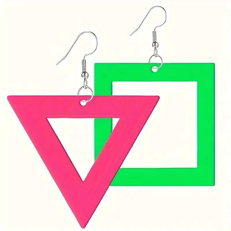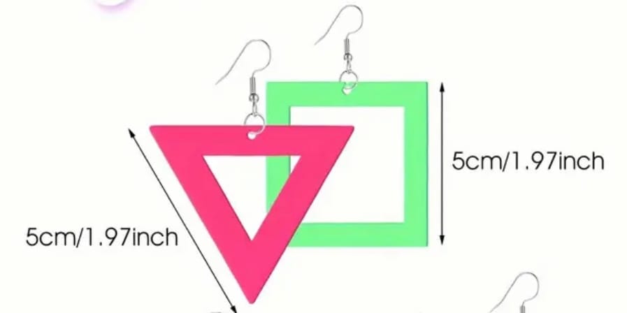 80s neon earrings, perfect for heaps of fancy dress costumes! 1 pair, made up of 2 neon earring, in a pack. The shapes are 5cm long. Suitable for pierced ears