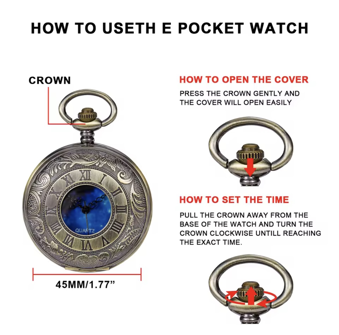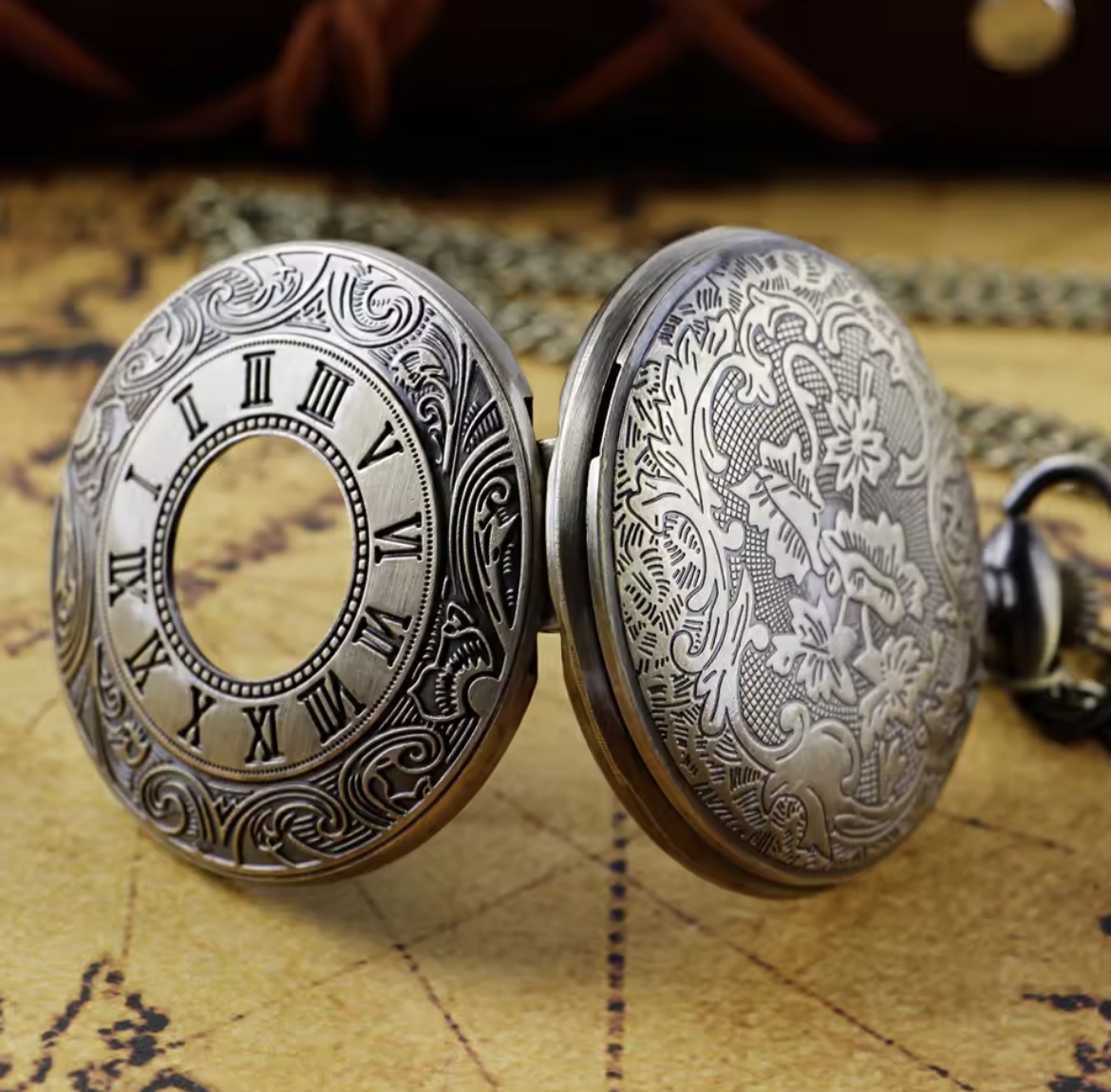 Step back in time with this vintage-inspired mechanical pocket watch, designed in the elegant style of the 1920s. Housed in a beautifully detailed case, this timepiece features a visible mechanical movement and includes a traditional FOB chain for authentic wear. Perfect for cosplay, formal events, collectors, or as a unique gift.