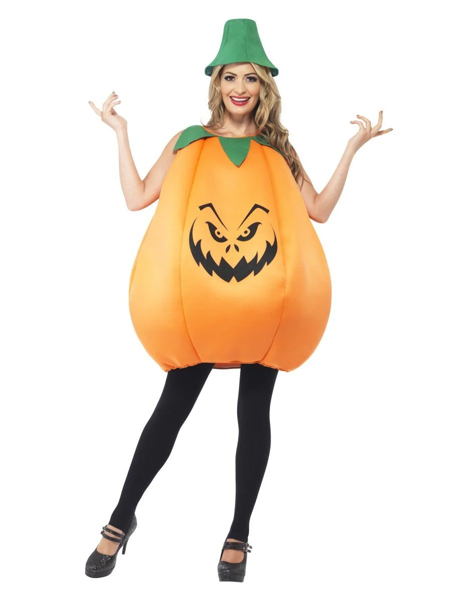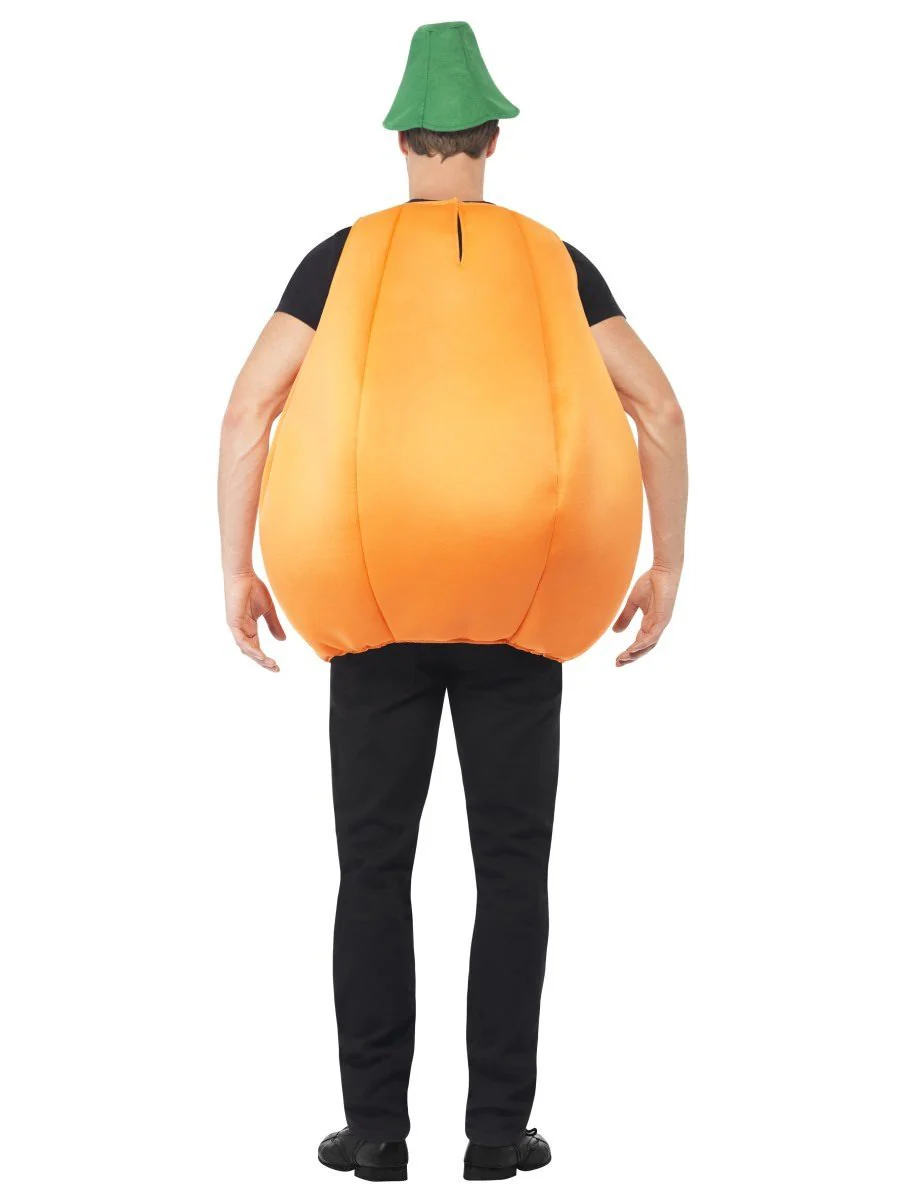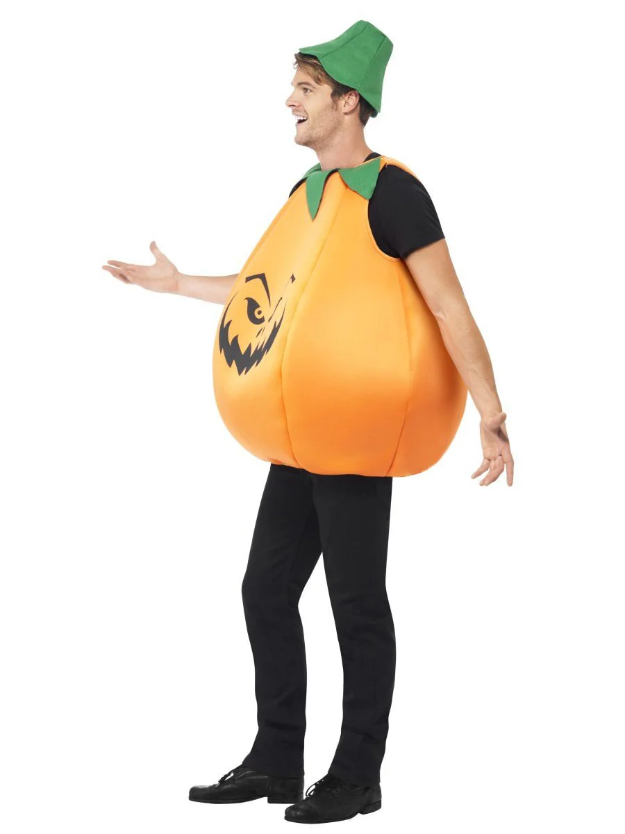 The Pumpkin Costume features a Bright Orange Over the Head Foam Tunic with a Black Evil Printed Face on the Front.