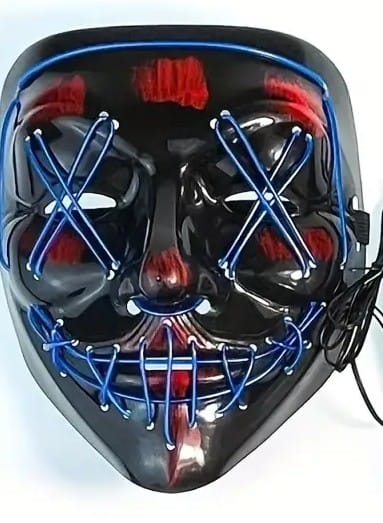 Mask – The Purge Light Up Glow in the Dark – Blue Plastic Mask with wide elastic band. 2 flashing and 1 x constant mode. Needs 2 x AA batteries (not included)