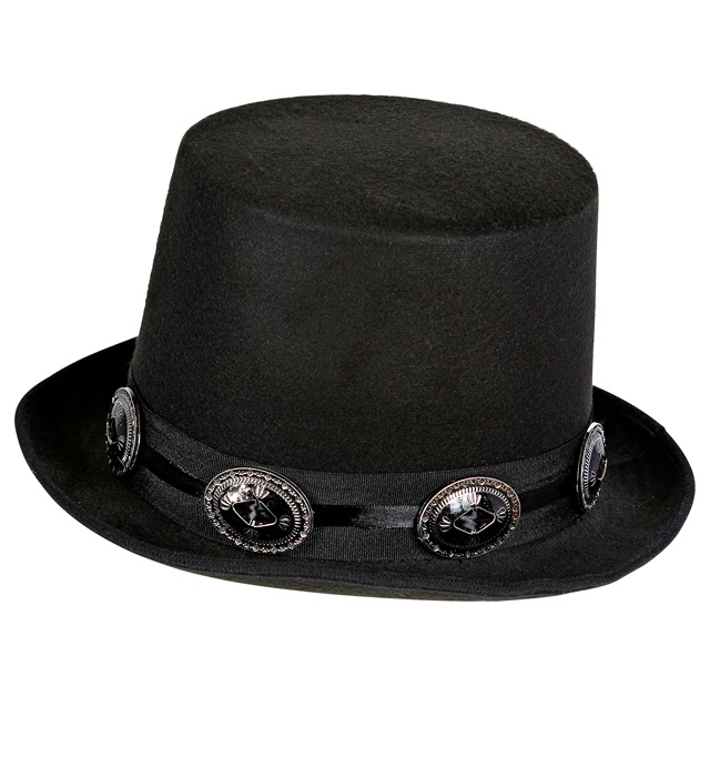 Add a bold finishing touch to your costume with this stylish Black Rocker / Victorian Top Hat. Featuring a classic felt design and a striking silver ornate buckle detail around the band, this hat blends vintage elegance with edgy rockstar vibes.
