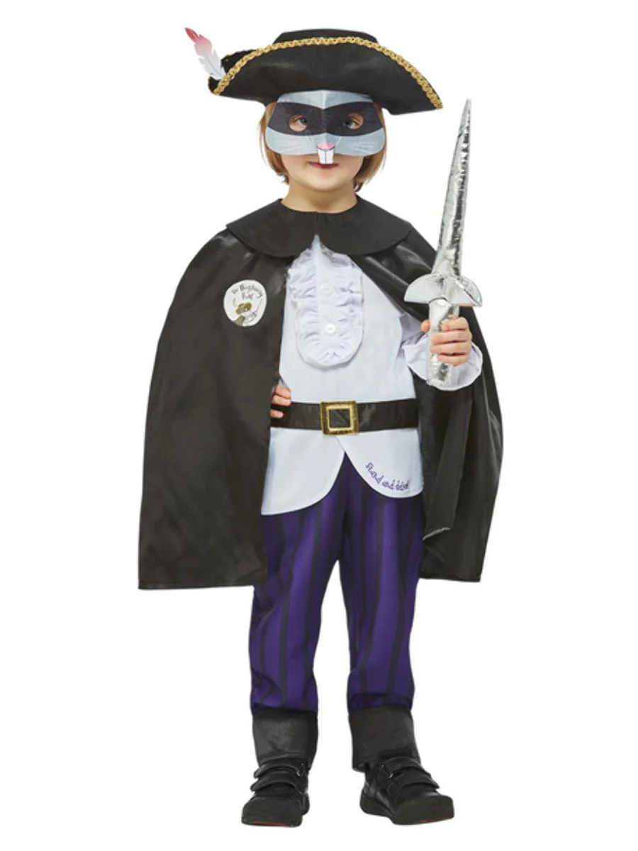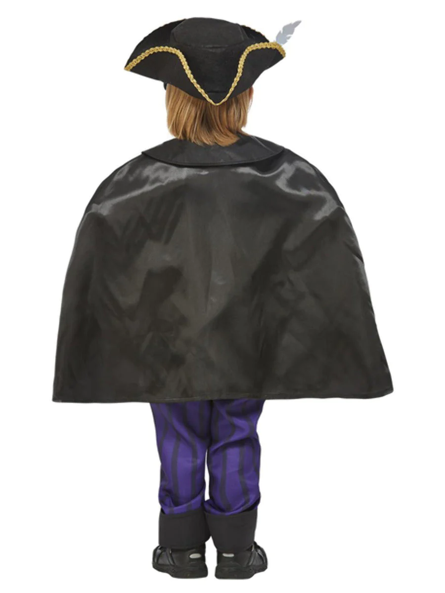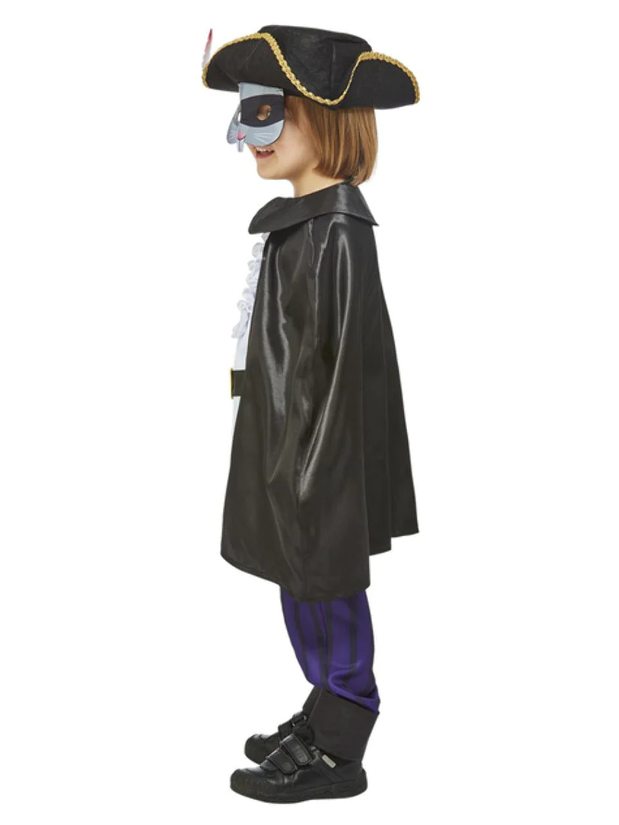 Package includes: shirt, cape, trousers, hat, mask & sword.