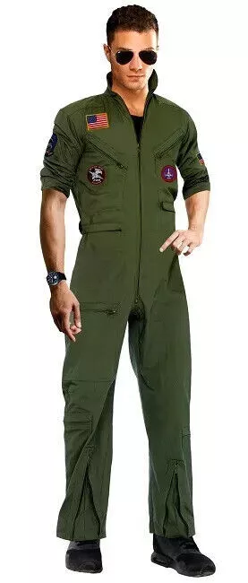 Our Top Gun Male Costume includes a dark green khaki jumpsuit with attached badges. The jumpsuit secures with a long zip fastening at the front, perfect for a quick transformation into this classic pilot.