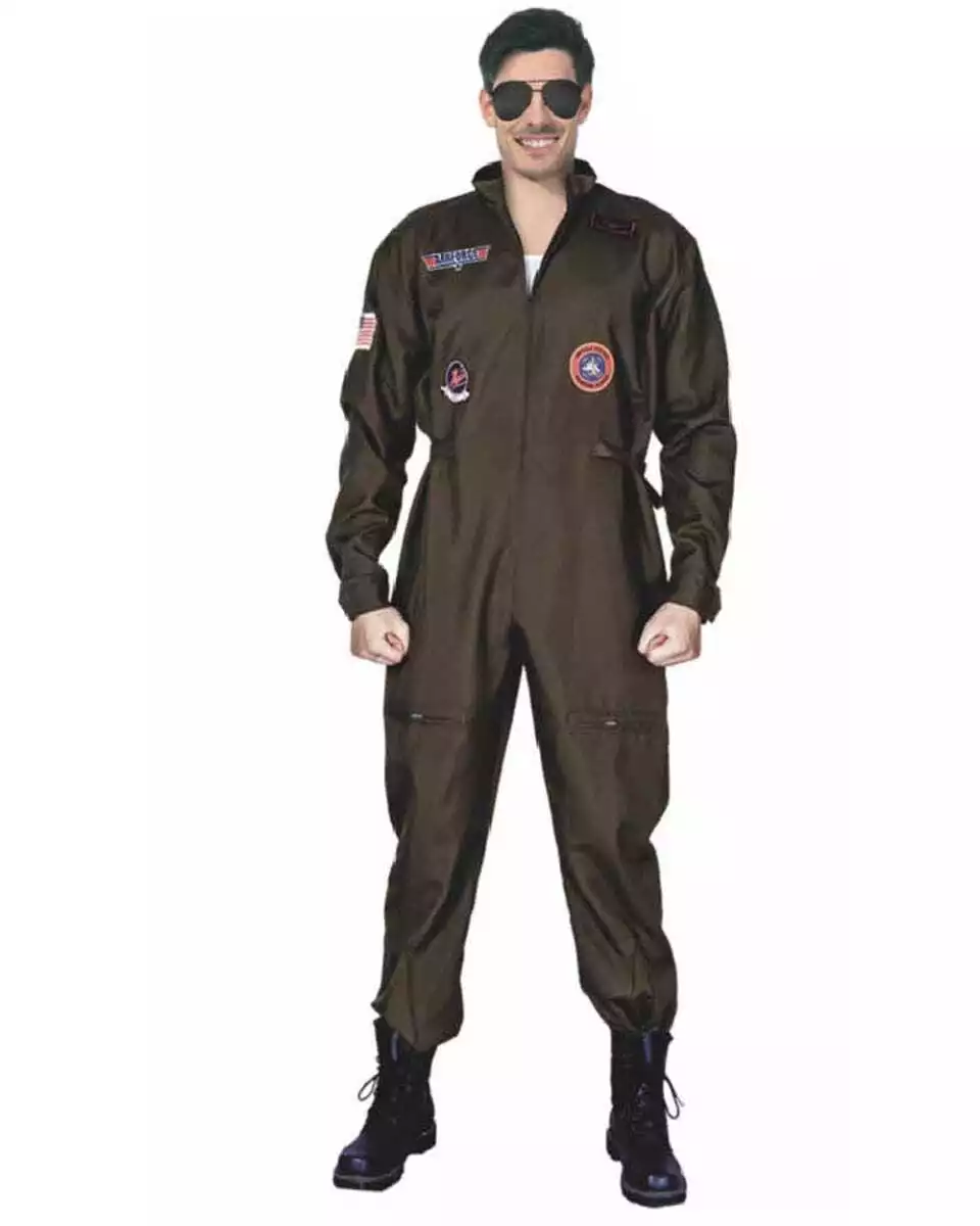 Our Top Gun Male Costume includes a dark green khaki jumpsuit with attached badges. The jumpsuit secures with a long zip fastening at the front, perfect for a quick transformation into this classic pilot.