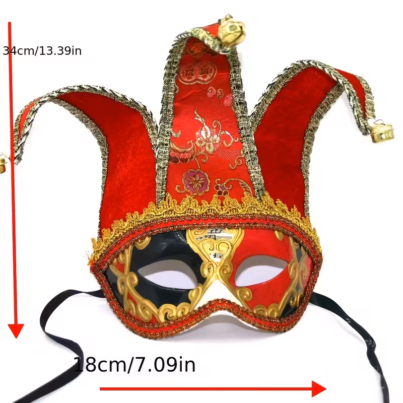 This Venetian Jester mask is a gold ribbon trimmed mask with three red peaks which have a bell attached at the top of each.